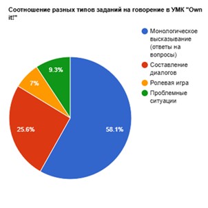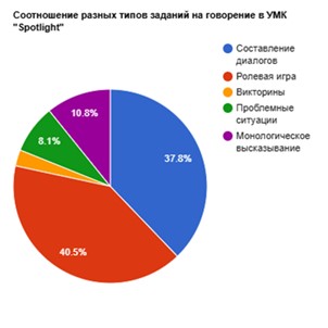 Рис. 1. Диаграммы «Процентное соотношение разных типов заданий на говорение в УМК «Spotlight» и УМК «Own It! Level 3»