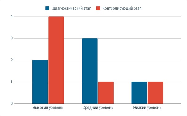 На завершающем этапе был проведён контролирующий срез, целью которого было оценить, насколько проблемные ситуации способствовали развитию устной иноязычной речи. Формат аналогичен диагностическому этапу: учащиеся разыгрывали ролевой диалог по теме «Interviewing someone». Один ученик играл роль журналиста, второй – знаменитости. Использование карточек с фразами и тематическими подсказками обеспечивало опору, но основное внимание уделялось самостоятельному формированию высказываний. Каждому участнику необходимо было произнести не менее 10 фраз, поддерживая логически связное интервью. Оценка производилась по тем же критериям, что и на первом уроке, что обеспечивало сопоставимость результатов. Результаты показали положительную динамику развития умений говорения: трое учащихся набрали от 12 до 15 баллов, двое - средний результат, один - низкий. Это подтвердило эффективность проблемных ситуаций в развитии навыков и умений спонтанного иноязычного говорения. Сравнение результатов диагностического и контролирующего этапов представлены на рисунке 2.