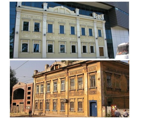 Завершают маршрут дом купца Горелика по улице Октябрьской, 82 (1901-1905 гг.), и дом братьев Тудоровских по улице Кобозева (начало ХХ века). Дом купца Горелика, являющийся памятником архитектуры и градостроительства, сохранился до наших дней в первозданном виде, выделяясь причудливыми очертаниями балконов, динамичным обрамлением окон, сдержанным декором фасадов и вставками облицовки из керамической плитки (см. рисунок 5). Дом братьев Тудоровских по улице Кобозева претерпел изменения: здание утратило кровлю и элементы фасада. Построенное предположительно в 1901-1904 годах, здание служило клубом и театром в начале XX века. После революции театр-клуб еще некоторое время использовался в качестве культурного центра. С начала 70-х годов и по настоящее время в здании расположен Донецкий государственный экономико-технологический техникум.