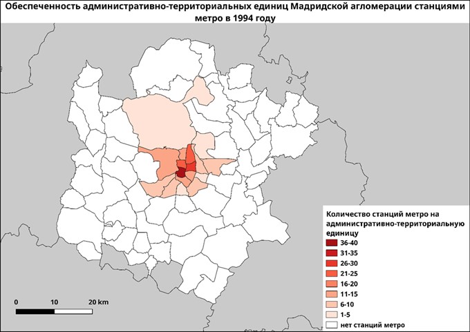 Рис. 1. Обеспеченность административно-территориальных единиц Мадридской агломерации станциями метро в 1994 г. Составлено автором