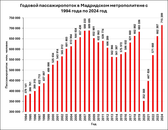 Рис. 4 Годовой пассажиропоток в Мадридском метрополитене с 1994 по 2024 гг. [2]* Составлено автором