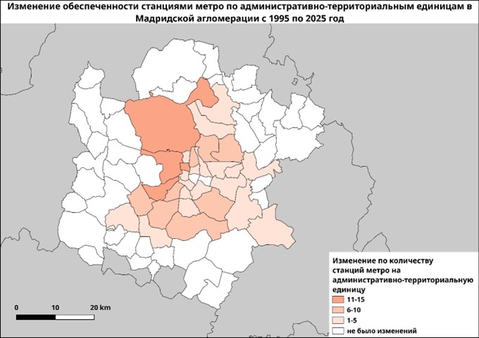Изменение обеспеченности стациями метро по административно-территориальным единицам в Мадридской агломерации с 1995 по 2025 гг. и изменения в годовом пассажиропотоке