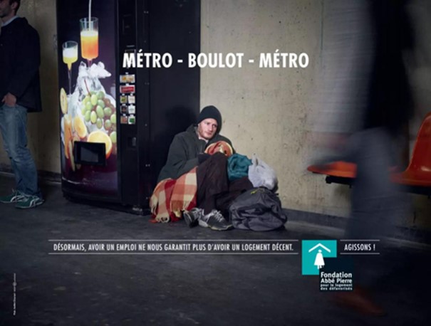 На примере визуальной рекламы кампанией Fondation Abbé Pierre показана реклама о жилищном кризисе (см. рисунок 2). На семиотическом уровне плакат материализует проблему социальной невидимости — состояние, при котором маргинализированные индивиды находятся в физическом пространстве города, но остаются исключены из внимания и общественного сознания. Визуальная иерархия плаката усиливает эффект невидимости: центральная фигура деперсонализируется через контраст материальных условий (пол вместо мебели, холл метро вместо дома), что создает впечатление слияния человека с архитектурной средой. Принцип деперсонализации используется для актуализации проблемы социальной маргинализации. Визуальное отсутствие-присутствие человека в плакате становится метафорой реальной социальной невидимости, превращая скрытую социальную проблему в видимый визуальный образ.