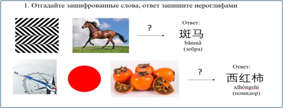 Обучение китайскому языку в российских школах становится все более актуальным, что определяет растущую необходимость поиска более эффективных методов обучения [10]. В настоящий момент одной из главных целей обучения иностранному языку в школе является формирование иноязычной коммуникативной компетенции, т.е. подготовка обучающихся к коммуникации на иностранном языке с представителями иной культуры. Так, одной из первостепенных задач педагога в обучении иностранному языку становится обучение лексике, так как сформированность лексического навыка определяет возможность осуществления иноязычной коммуникации и её продуктивность. Однако специфика китайского языка обусловливает дополнительные сложности для русскоязычных школьников, связанные с изучением лексики на начальном этапе, а также восприятием иероглифических знаков [6], [11]. В данной статье будет рассмотрено использование визуальных ребусов как средства формирования лексических навыков школьников, изучающих китайский язык. Применение логических упражнений, которые задействуют визуальные образы и ассоциативные связи, представляется перспективным. Подобные задания не только позволяют разнообразить урок, но и эффективно решают задачу по повышению учебной мотивации школьников, что, в свою очередь, поможет обучающимся прочно овладеть новыми лексическими единицами китайского языка и сделает процесс формирования лексического навыка более эффективным.