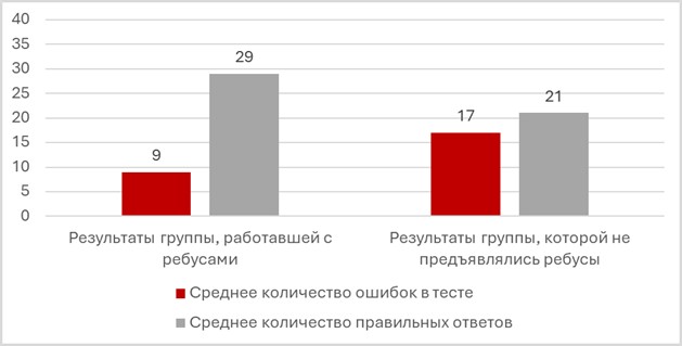 На контролирующем этапе ученики вновь выполнили диагностические задания, аналогичные первоначальным, но по новому лексическому материалу (40 л.е., входящие в состав пройденного учебного блока), что позволило зафиксировать динамику сформированности лексического навыка. Результаты теста продемонстрировали, что обучающиеся, работавшие с визуальными ребусами, в среднем делали на 8 ошибок меньше, чем обучающиеся из второй группы (см. диаграмму 1). В рамках контролирующего этапа была собрана обратная связь: обучающиеся поделились своим мнением об эффективности работы с ребусами в ходе итогового обсуждения или анкетирования. Более 80% пятиклассников ответили, что работа с ребусами была для них интересна, и они хотели бы видеть такие задания на уроках в будущем.