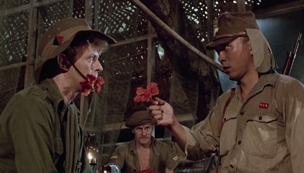 Фильм 戦場のメリークリスマス (сэндзё но Мерии Курисумасу) «С Рождеством, мистер Лоуренс» (1983), основанный на романе Лоренса ван дер Поста, переносит анализ кризиса мужской идентичности в контекст военной структуры. Капитан Ёнои, японский офицер, воплощает внешнюю силу и дисциплину, но страдает от внутреннего конфликта, вызванного столкновением репрессированных желаний с социальными ожиданиями [9]. Его взаимодействие с майором Джеком Селльерсом, британским военнопленным, становится центральным элементом фильма. Сцены их встреч, особенно первая и диалог о культурных различиях подчеркивают попытку Ёнои преодолеть культурные и эмоциональные барьеры (см. рисунок 9). Жест срезания пряди волос Селльерса символизирует переход от ненависти к уважению, но трагический финал, где Селльерс умирает, закопанный в землю, демонстрирует невозможность полного примирения в условиях войны [5]. Пространственная организация лагеря усиливает символику изоляции и конфликта, отражая внутреннее состояние персонажей [1].