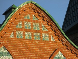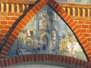 Уличный фасад здания щедро украшен цветной керамической плиткой (см. рисунок 9). Необходимо отметить, что декоративные панно и изразцовые заполнения на фасаде являются остатками от оформления фасадов какого-то другого здания. На это указывает разница цветовой гаммы, различная техника исполнения, дополнительные вставки немодульной изразцовой плитки.