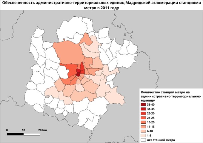 К 2011 г. метрополитен появился во всех 21 районах города Мадрид и в 11 из 51 муниципалитетах Мадридской агломерации. Обеспеченность административно-территориальных единиц Мадридской агломерации можно увидеть на рисунке 2. Численность населения агломерации Мадрида на 2011 год было равно 6,1 млн чел. [5; 7; 11]. Численность населения административно-территориальных единиц, в которых есть метрополитен, составляло 4,6 млн чел. [5], [7], [11], что равно 75,4% численности населения Мадридской агломерации. Стоит учитывать, хотя метро и появилось только в 11 муниципалитетах Мадридской агломерации, численность населения этих муниципалитетов на 2011 г. составляло 1,4 млн чел., равное 50% численности всех муниципалитетов в пределах Мадридской агломерации, составлявшие 2,8 млн чел. по состоянию на 2011 г. [7].