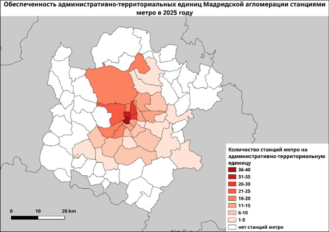 С 2012 по 2025 гг. в Мадридской агломерации построены 3 станции метро на 3 линиях метро, появившиеся в двух муниципалитетах Мадридской агломерации. Обеспеченность административно-территориальных единиц Мадридской агломерации на 22 августа 2025 г. можно увидеть на рисунке 3.