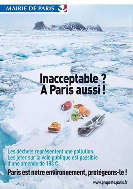 Рассмотрим пример рекламной кампании о загрязнении городской среды (см. рисунок 1). Семиотическая структура анализируемого рекламного плаката построена на конфликте между визуальным и вербальным компонентами. Визуальный ряд репрезентирует природный топос, обладающий в коллективном сознании статусом эстетического и экологического идеала – замерзший океан, относящийся к категории охраняемых природных объектов. На этом фоне диссонирующим элементом выступает бытовой мусор, создающий семиотическую оппозицию «природное/бытовое». Вербальный компонент – надпись «Inacceptable? – A Paris aussi!» (Непозволительно? – В Париже тоже!) – выполняет функцию прагматического катализатора. Риторический вопрос актуализирует у реципиента однозначно негативную оценку изображенной ситуации. Однако последующая экскламативная реплика производит семантический сдвиг, осуществляя пространственную проекцию проблемы из удаленной «заповедной» локации в повседневную урбанистическую среду Парижа.