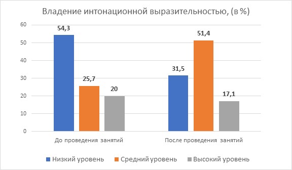 Результаты контрольного этапа исследования показали, что 51,4% обучающихся (18 чел.) имеют средний уровень интонационной выразительности, что выражено тем, что при выполнении заданий школьники допускали незначительные ошибки, неправильно расставляли в предложениях ударения, не всегда правильно эмоционально реагировали.