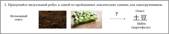 Далее последовательно рассмотрим преимущества использования визуальных ребусов в обучении лексике. Во-первых, они обладают наглядностью, важность которой отмечает О.А. Масловец, говоря о проблемах обучения лексической стороне речи китайского языка в школе [9]. Во-вторых, при работе с визуальными ребусами обучающиеся могут увидеть, как работают основные словообразовательные принципы китайского языка, особенно семантическое сложение. Как отмечает Н.Д. Гальскова, лингвистические знания в области лексики необходимы для полноценного осуществления продуктивных видов речевой деятельности [4]. В-третьих, визуальный ряд ребуса способен сформировать устойчивую ассоциацию, придавая визуальным ребусам мнемотехнический характер. Задействование подобных когнитивных механизмов способствует совершенствованию рецептивных навыков. Более того, визуальное сопровождение может помочь обучающимся понять образность мышления, которым характеризуется китайская языковая картина мира.